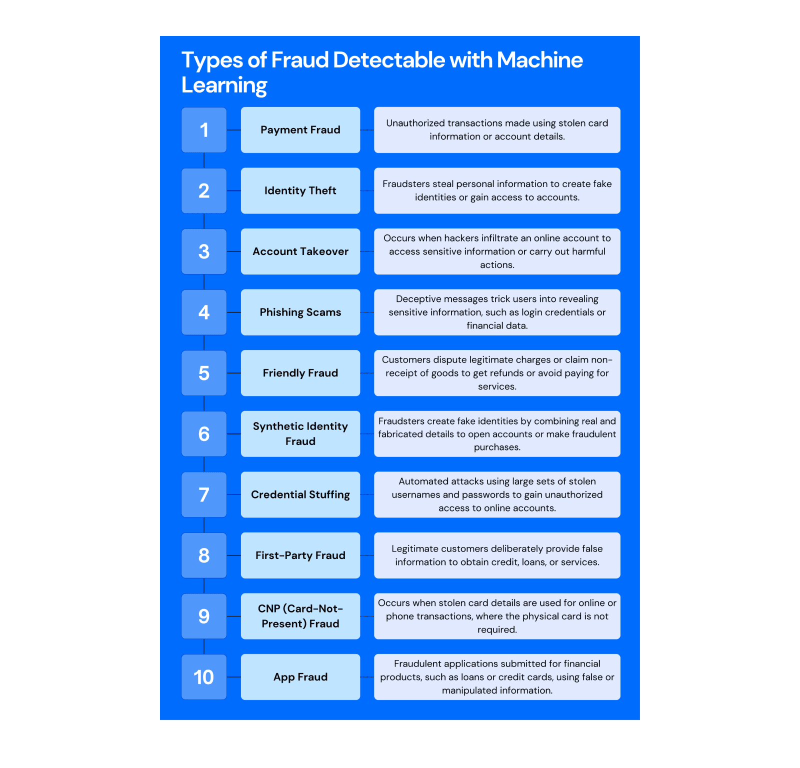 Fraud comes in many forms, far beyond the common examples like phishing. Each type requires a tailored approach to detection and prevention, as fraudsters continually adapt their methods. The following illustration highlights different types of fraud: