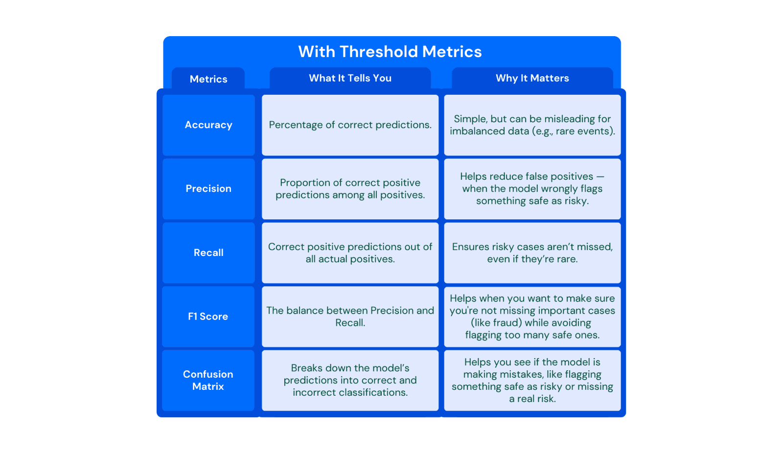 With Threshold: These metrics use a predefined cut-off point to classify outcomes. For example, in fraud detection, a threshold might be set to flag transactions above a certain likelihood of being fraudulent. These metrics are useful for decision-making tasks where clear classification is needed, like fraud detection or credit approval.