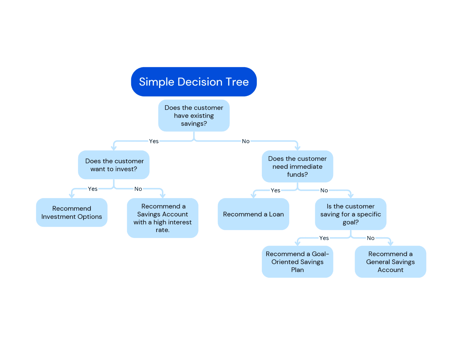 Types: Classification Trees for categorical outcomes (e.g., predicting whether a customer defaults or not) and Regression Trees for continuous outcomes (e.g., predicting a customer’s credit score).