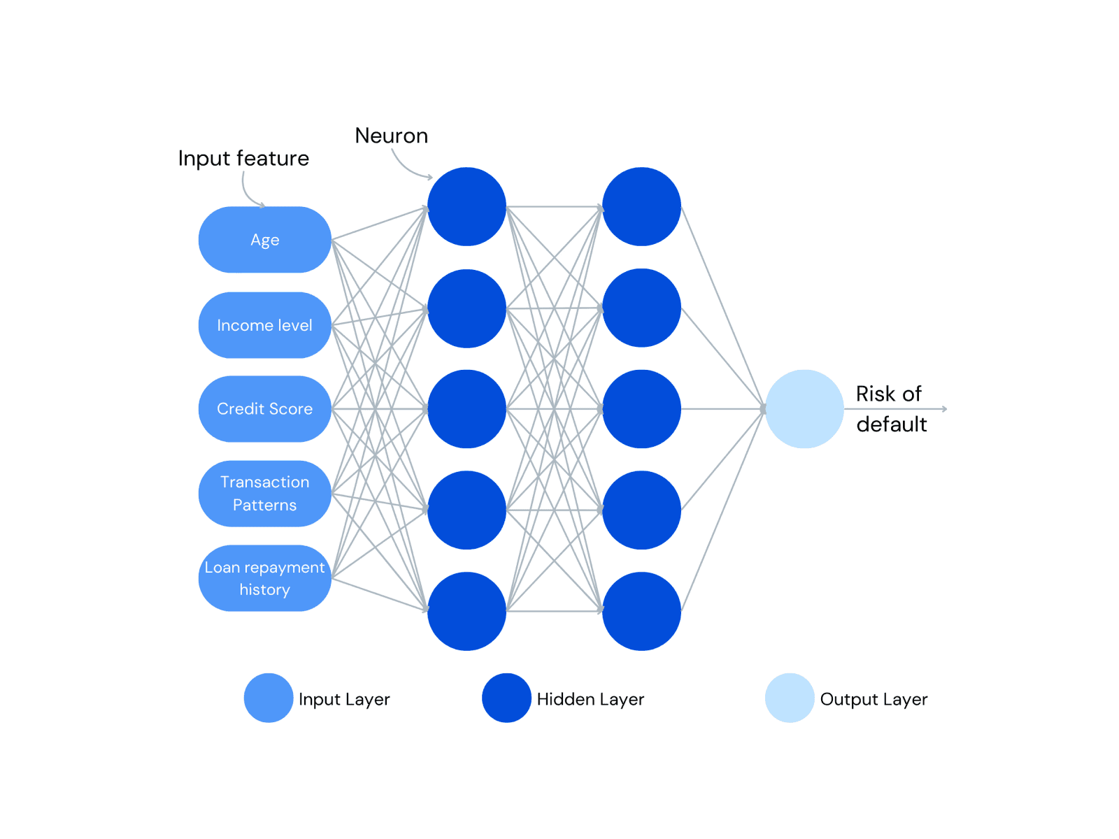 Why It’s Effective: DNNs excel at analyzing diverse data types, from structured (numerical and categorical) to unstructured (text, images). For risk prediction, DNNs can sift through massive datasets to uncover subtle, hard-to-detect patterns. For example, changes in customer communication patterns—such as increased calls to unfamiliar numbers—might indicate financial instability, which a DNN could identify early in the data.