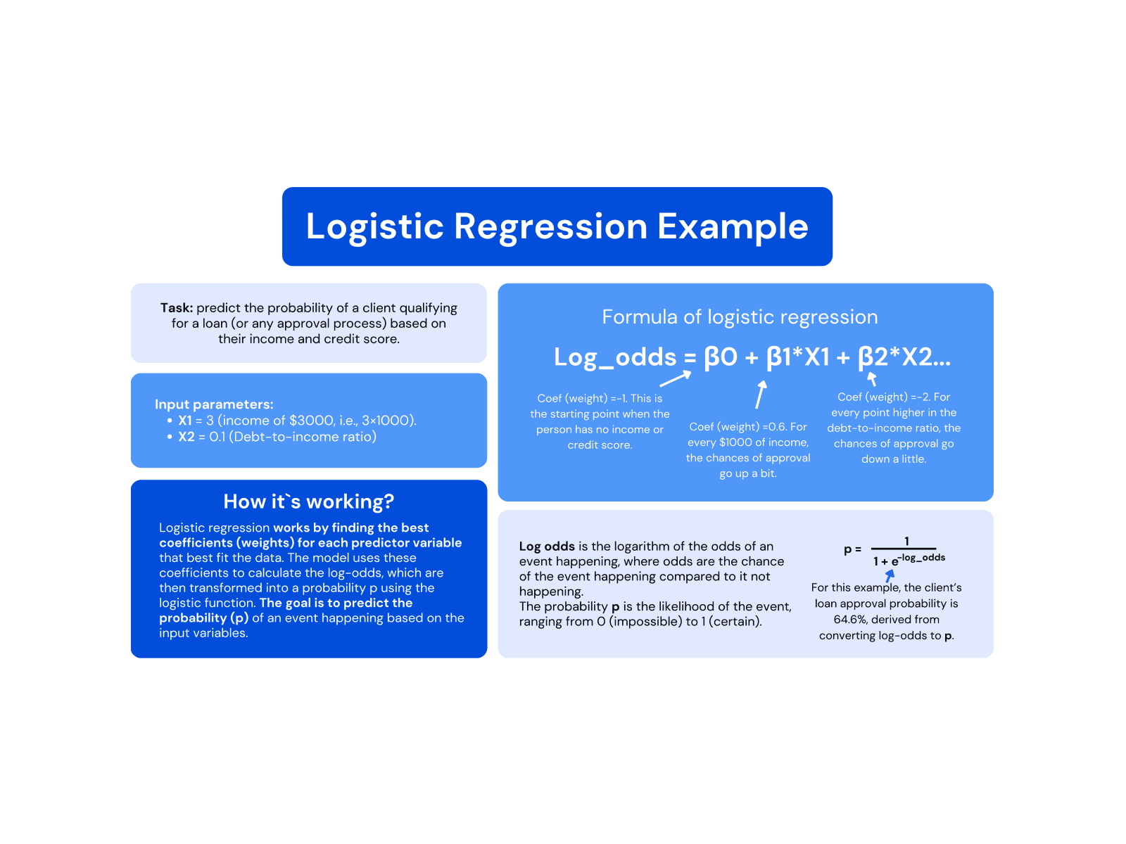 What It Is: Logistic Regression is a statistical algorithm used to predict binary outcomes (e.g., yes/no, 0/1) based on one or more independent variables. It models the probability of an event occurring by applying a logistic function, which outputs values between 0 and 1.