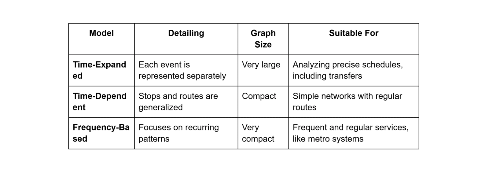 Transit-Network, on the other hand, is more like navigating a bus or train system. In these networks, the challenge is not only to find the shortest distance but to factor in time schedules, waiting periods, and transfers between different transport modes. A node in the graph doesn’t just represent a physical location but a specific event (such as the arrival or departure of a train). This makes transit networks far more complex, as the pathfinding algorithm must consider dynamic elements like transfer times and timing constraints in addition to just the spatial distance.