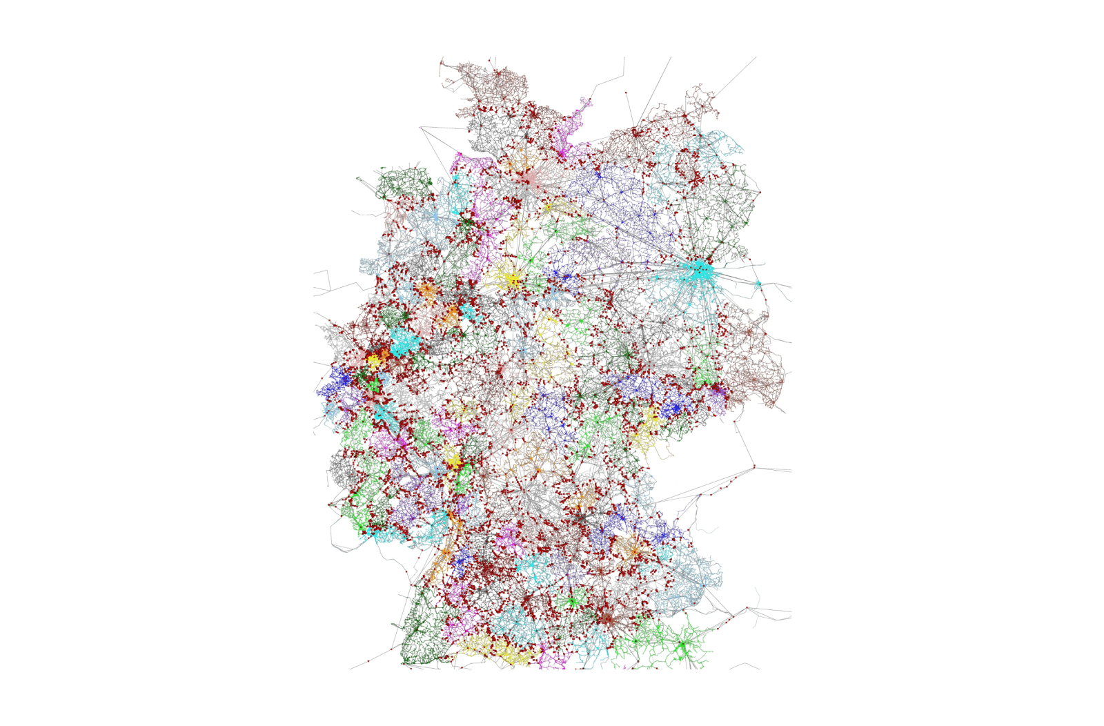 The public transit network of Germany (dots and lines), split into clusters (shown in various colors). Of all 251,763 stops, only 10,886 (4.32%) are boundary stops, highlighted as red boxes.
