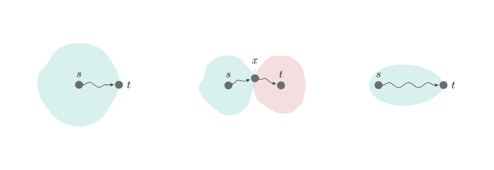 This illustration from the article [2] demonstrates how the search space decreases when finding the shortest path using different algorithms. The left figure shows Dijkstra's algorithm, which explores the entire search space radiating outward from the source node sss. The middle figure illustrates bidirectional search, which reduces the search space by simultaneously exploring from s and t and meeting at an intermediate node x. The right figure represents the A* algorithm, which focuses the search towards the target node t by utilizing a heuristic, significantly narrowing the area that needs to be analyzed.
