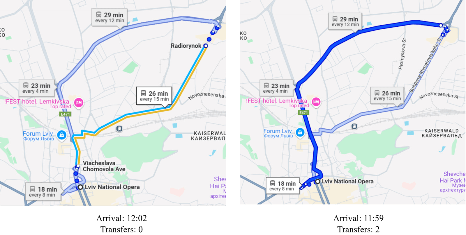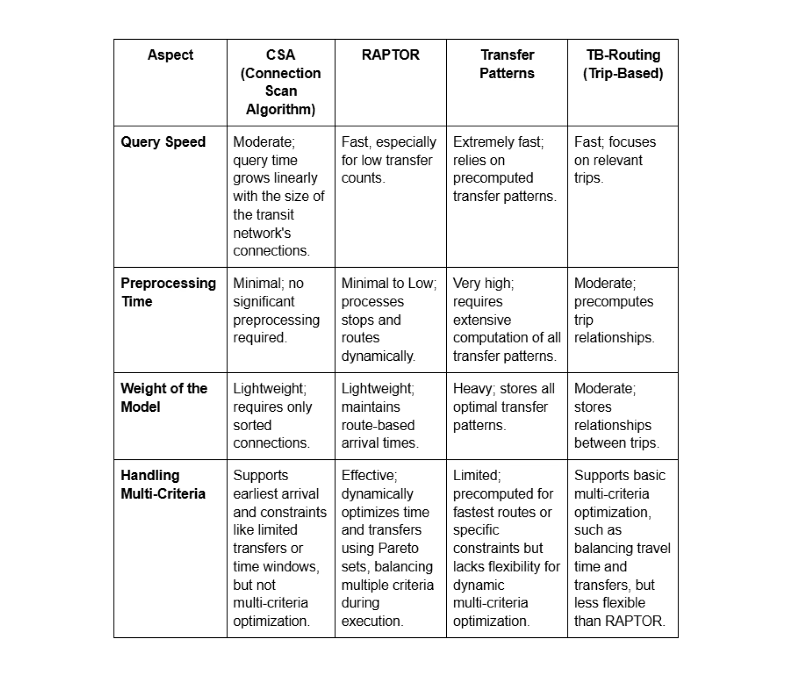 Efficient Handling of Multi-Criteria Optimization: If the number of transports is among the criteria for selection, RAPTOR dynamically updates Pareto-optimal paths during execution.