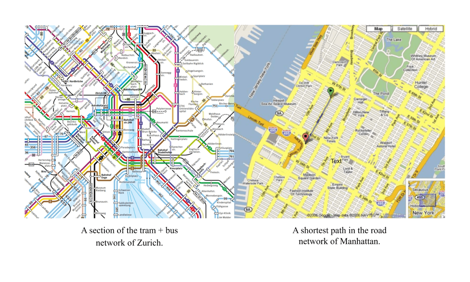 The visual below highlights this difference: on the left, a road network of Manhattan where the shortest path is calculated based on distance, and on the right, a transit network of Zurich, where schedules and transfers are key to finding the optimal route [1]: